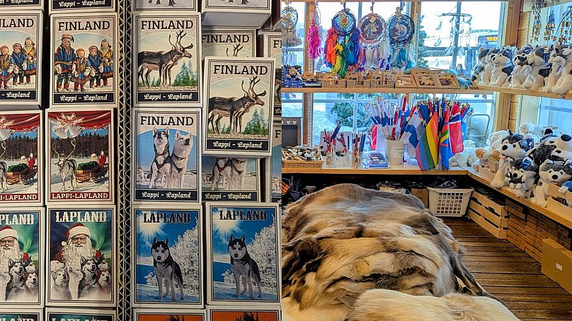 Coachloads of visitors flood into the shop and browse through aisles packed with Santa statues, Christmas decorations, and "Lapland Shaman" figures. Display boxes depict scenes featuring individuals wearing faux Sámi attire. Images of huskies appear on postcards, stuffed toys, coffee mugs, fridge magnets, and even dream catchers — an item originating from North American Indigenous traditions.