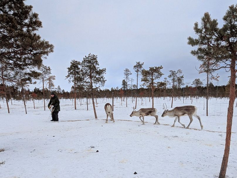 As soon as Raisa Kitti steps into the paddock, the reindeer gather around her, nudging their large, fuzzy noses into the sled filled with food that she is pulling behind her.